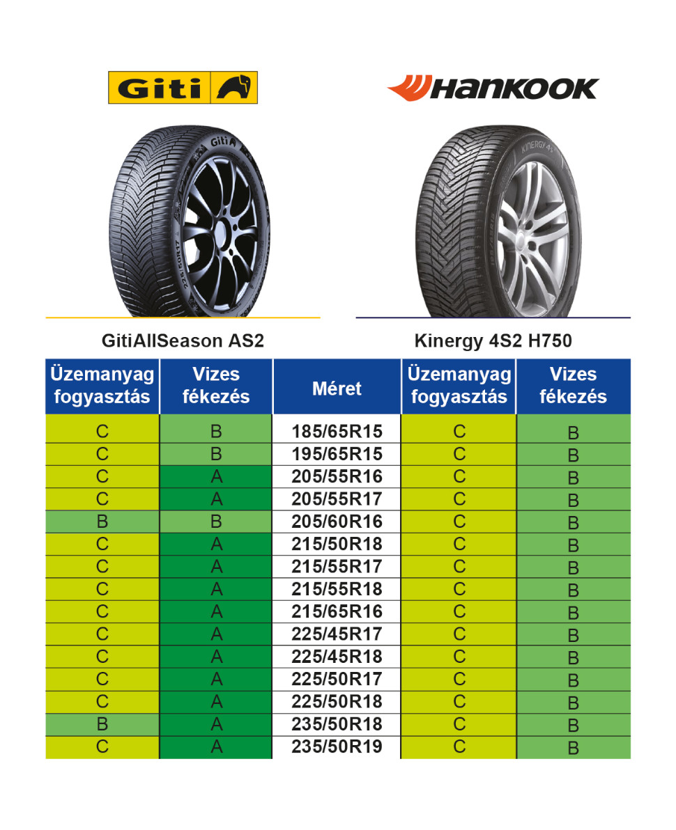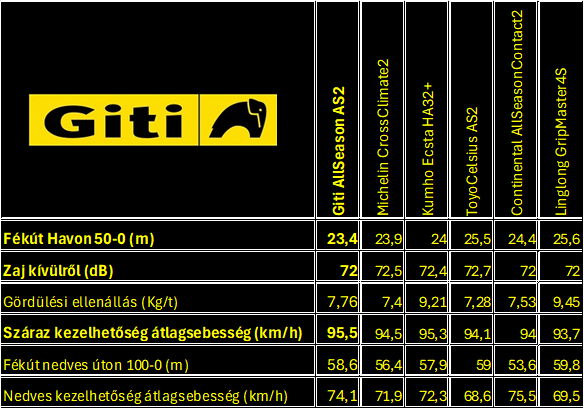 2024-ben lezajlott AUTO BILD autósmagazin négyévszakos tesztjén 37 márkát vizsgáltak. A Giti GitiAllSeason AS2 a legjobbak közé került be a kiváló nedves, havas tapadásának és hosszú élettartahalkabb menettulajdonságai